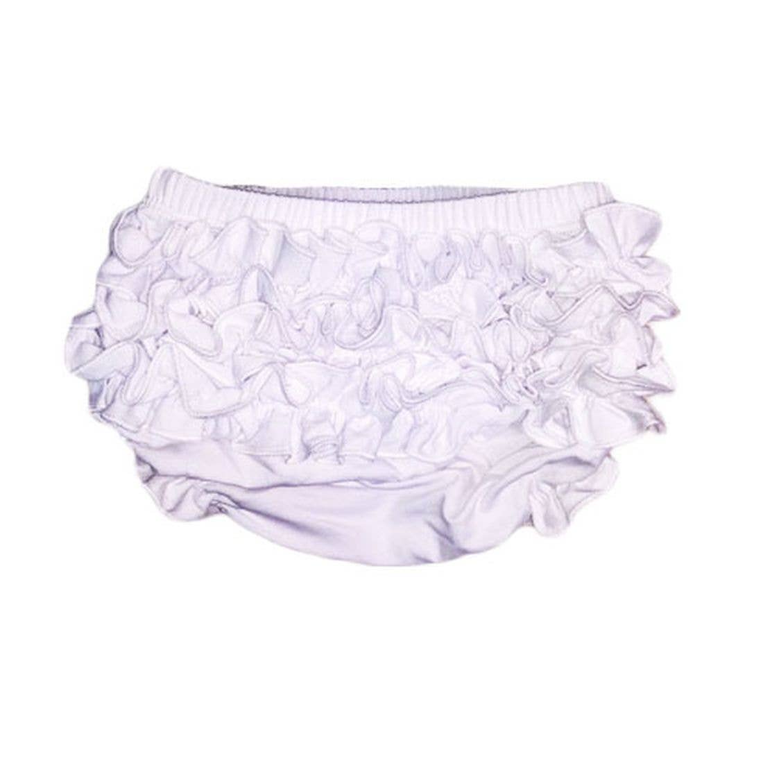 White ruffle baby bloomers. 95% Cotton, 5% Spandex. Size 6-24mths.