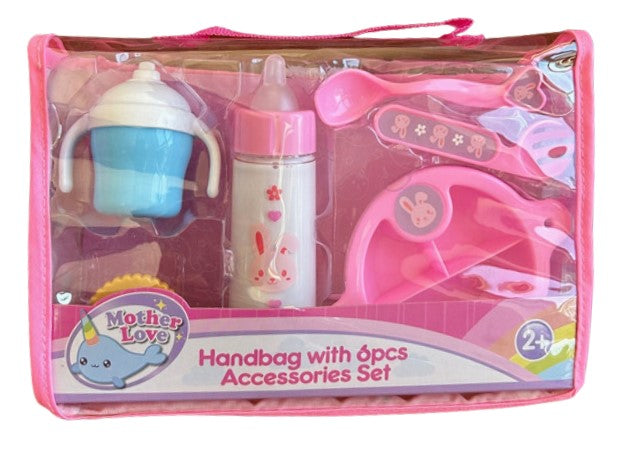 Fuel your child's imagination with our Doll Feeding Set! With a velcro fastening carry bag and 6 essential pieces, including a baby bottle, sippy cup, bowl, spoon, fork, and biscuit, your little one can easily feed their dolls. Encourages nurturing and imaginative play!