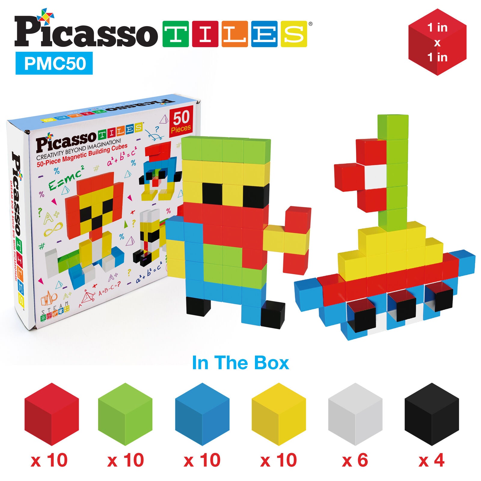 PicassoTiles 50 piece magnetic puzzle cube set (PMC50) features easy click and collect magnet connectors hidden in the cubes to allow intuitive play and fun educational STEM skill learning experiences. Facilitate problem solving and fine motor skills, spatial reasoning, logic training, critical thinking, hand-eye coordination, and child brain development, by promoting creativity. If you can imagine it, you can build it and create it!