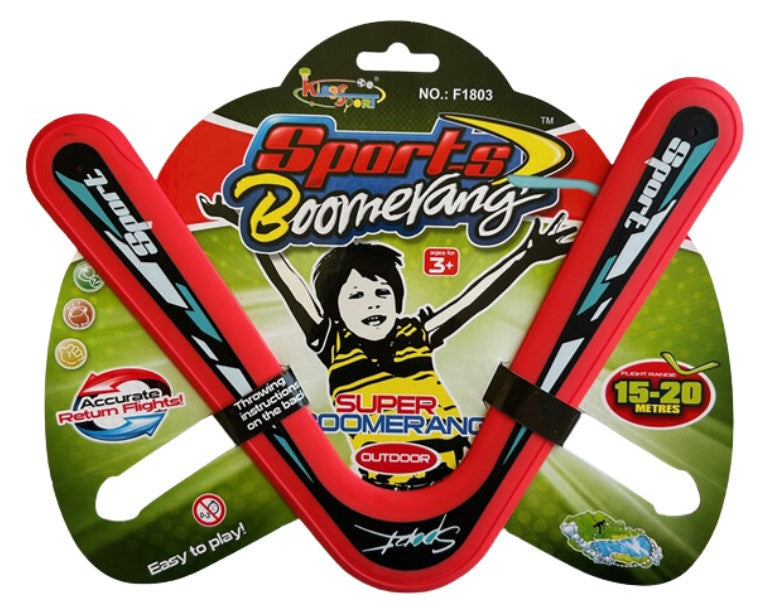 26.5cm wide rubbery plastic boomerang. Flight range - 15-20m. Accurate return flights.